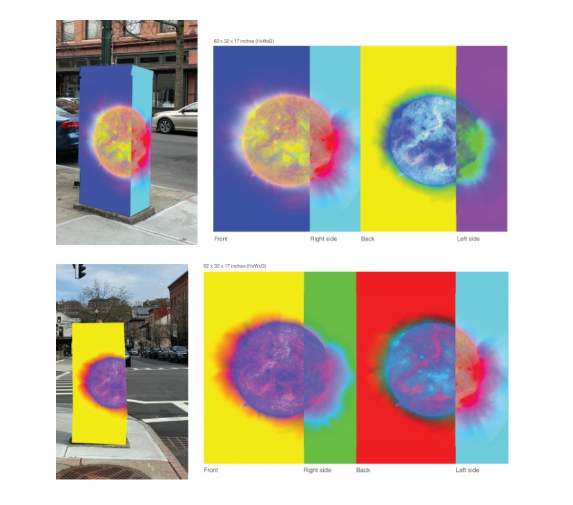 Two lightbox graphic installations in downtown Troy, installed December 2024: Corner of Congress and 3rd Streets and Corner of River and Fulton Streets.