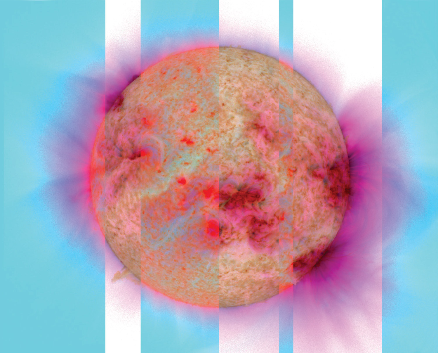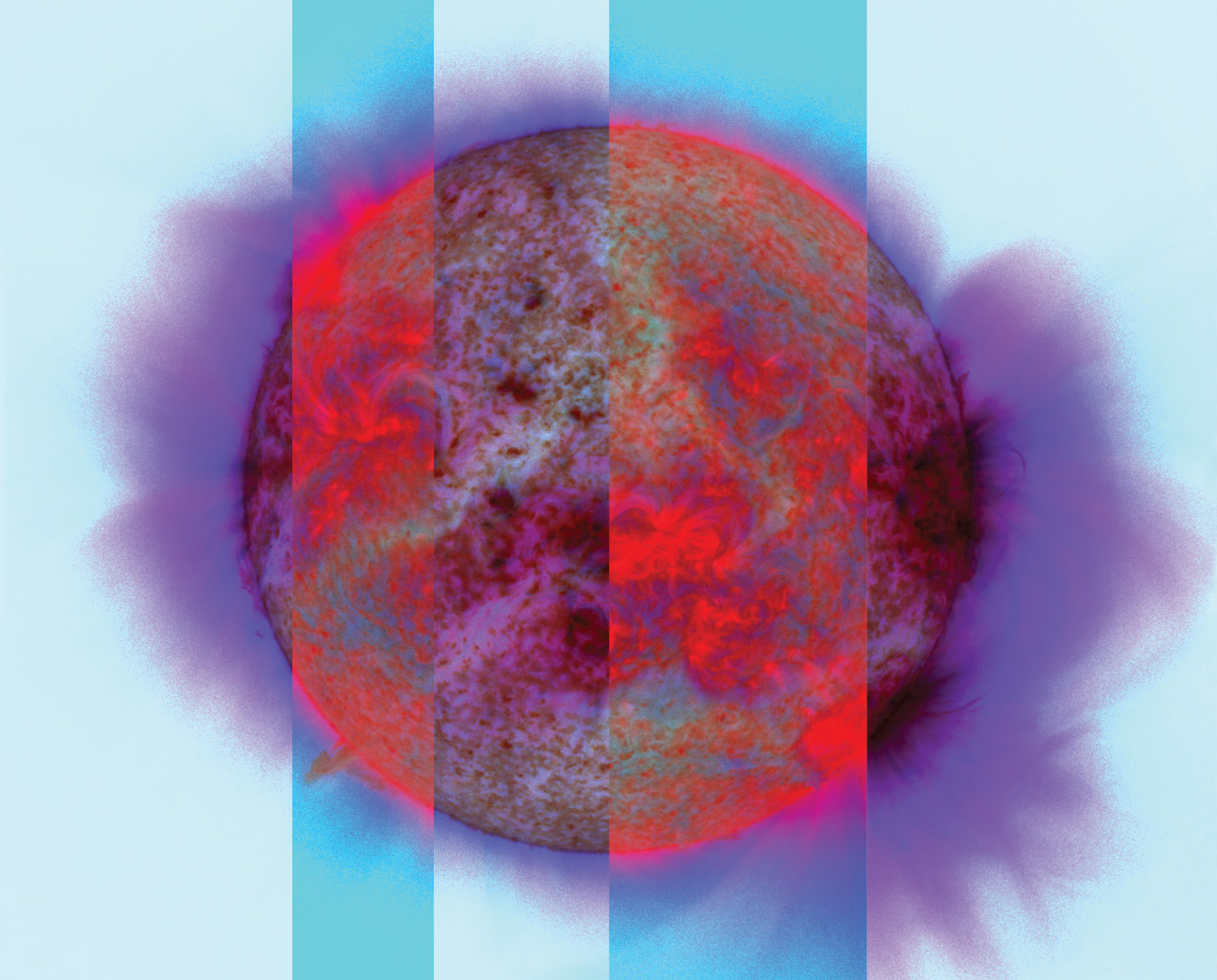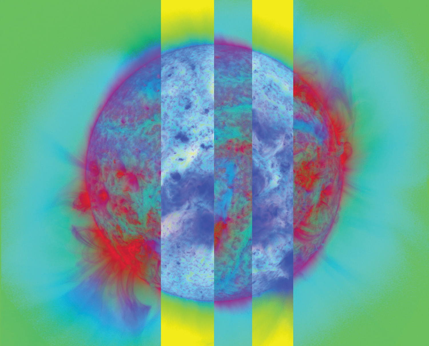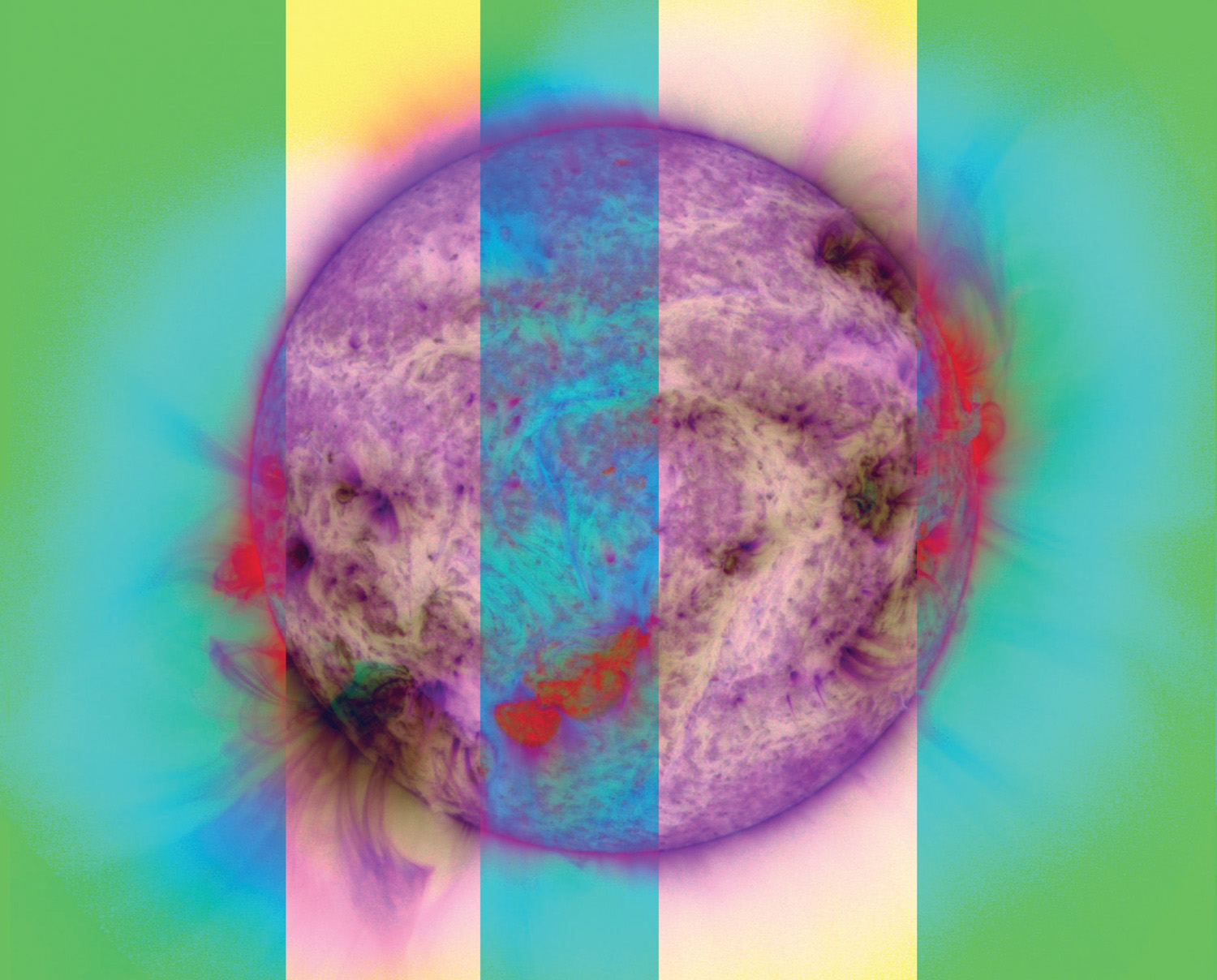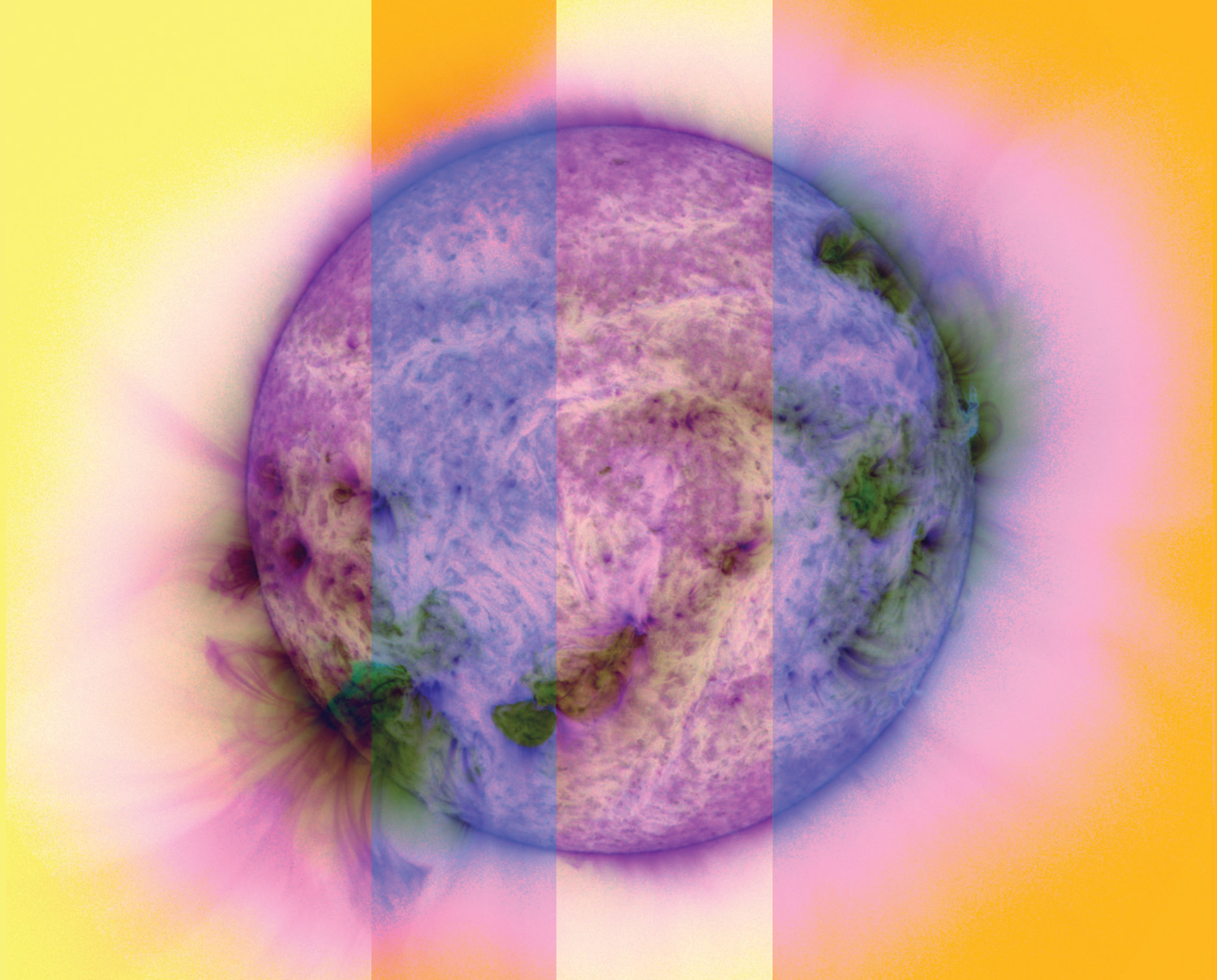 What color is the sun? The light of the sun contains all colors; what if we depict the sun in a different color than the standard yellow? These images are created using images captured by a weather satellite orbiting Earth. The greyscale images taken at different wavelengths were combined in RGB channels to create unique color images. [Related project: Here GOES Radiotelescope (Heidi Neilson & R. Dove)]